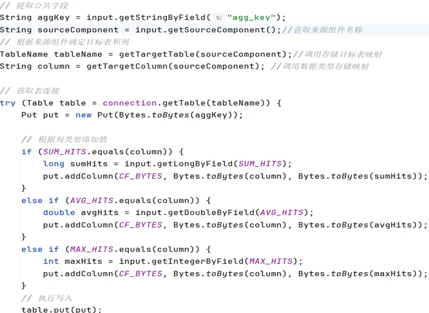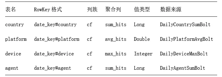 在存储层中,我们设计了对不同维度的数据内容存储的数据模型,通过上层交付的数据,HBaseWriteBolt 类将从各个聚合 Bolt 接收聚合结果,并将其写入 HBase 表: