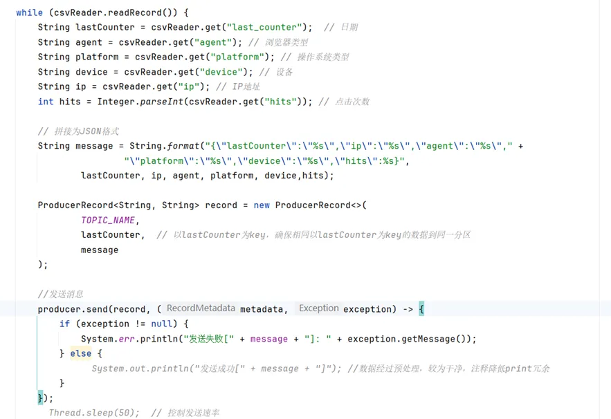 通过系统架构设计说明结合数据特征与业务需求, CsvDataProducer 类负责从 CSV 文件读取数据并发送到 Kafka 主题。具体实现步骤如下: