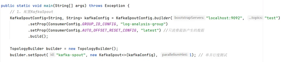 - 使用 KafkaSpoutConfig 构建 KafkaSpout 的配置,指定 Kafka 服务器地址、主题名称、消费者组 ID 和偏移量重置策略。