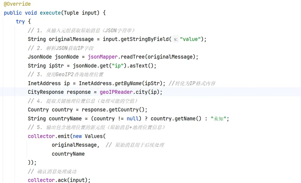 - 通过初始化 GeoIP2 数据库读取器和 JSON 解析器,将上层交付的输入元组中获取原始数据内容,提取IP字段,通过GeoIP2查询并获取国家或地区名称信息。