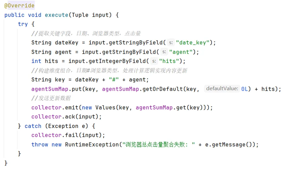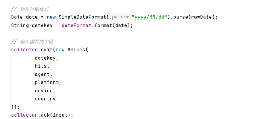 我们把DataParseBolt 类作为第二层 Bolt。该 Bolt 接收来自第一层 IpLocationBolt 输出的元组,使用 JSON 解析器对输入元组中的 JSON 数据进行解析,从中提取出如日期、点击量、浏览器类型等关键数据。在日期处理方面,会把提取到的日期格式转换为统一格式,以方便后续的聚合和处理操作。最后,将处理后的数据重新组合成新的元组发射出去,以便后续不同类型的聚合 Bolt 进行针对性计算。