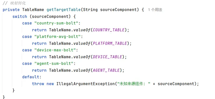 - 通过映射方法getTargetTable,根据源组件名称映射到对应的 HBase 表。
