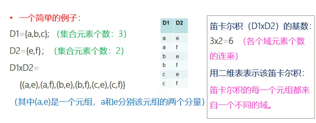 笛卡尔积可表示为一个二维表,表中的每行对应一个元组,表中的每列对应一个域