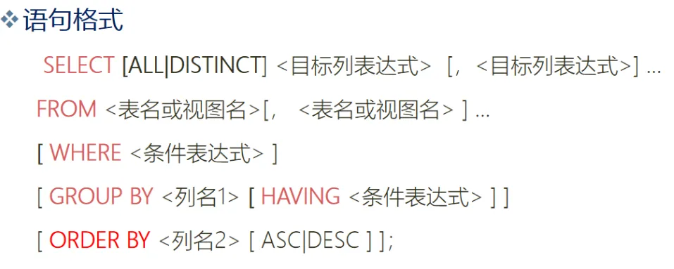 #创建索引 次序:ASC(升序) DESC(降序)CREATE [UNIQUE]|[CLUSTER] INDEX <索引名> ON [表名](<列名>[<次序>],...)#删除索引DROP INDEX <索引名>数据查询