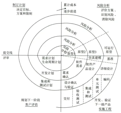 瀑布模型和演化模型结合起来,加入了两种模型均忽略的风险分析,弥补了两种模型的不足。螺旋模型将开发过程分为几个螺旋周期,每个螺旋周期大致和瀑布模型相符合