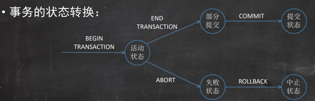 • ABORT:标志事务进入失败状态,系统撤销事务中所有操作对数据库和其他事务的影响,结束事务的运行
