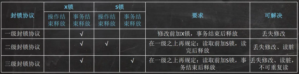 • 其他事务对数据A不能再加任何锁,从而也不能读取和修改数据A,直到事务T释放A上的锁