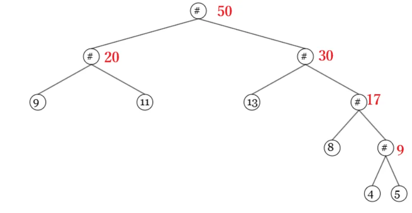 例如:给定的n个权值{[4,5,8,9,11,13],构成n棵二叉树的集合F