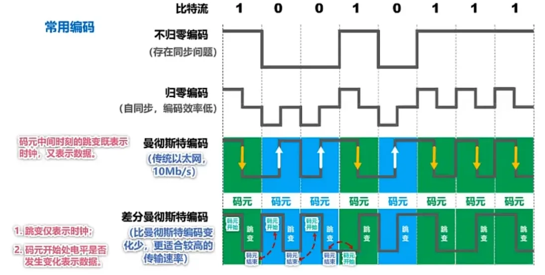 □内同步:发送端将时钟同步信号编码到发送数据中一起传输(例如曼彻斯特编码)