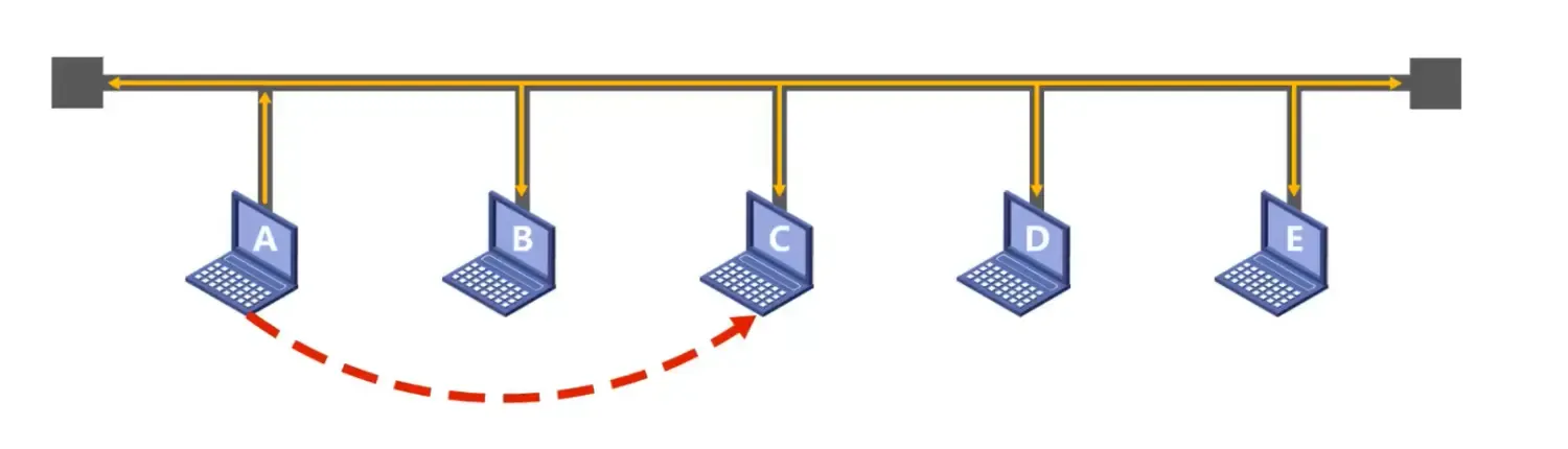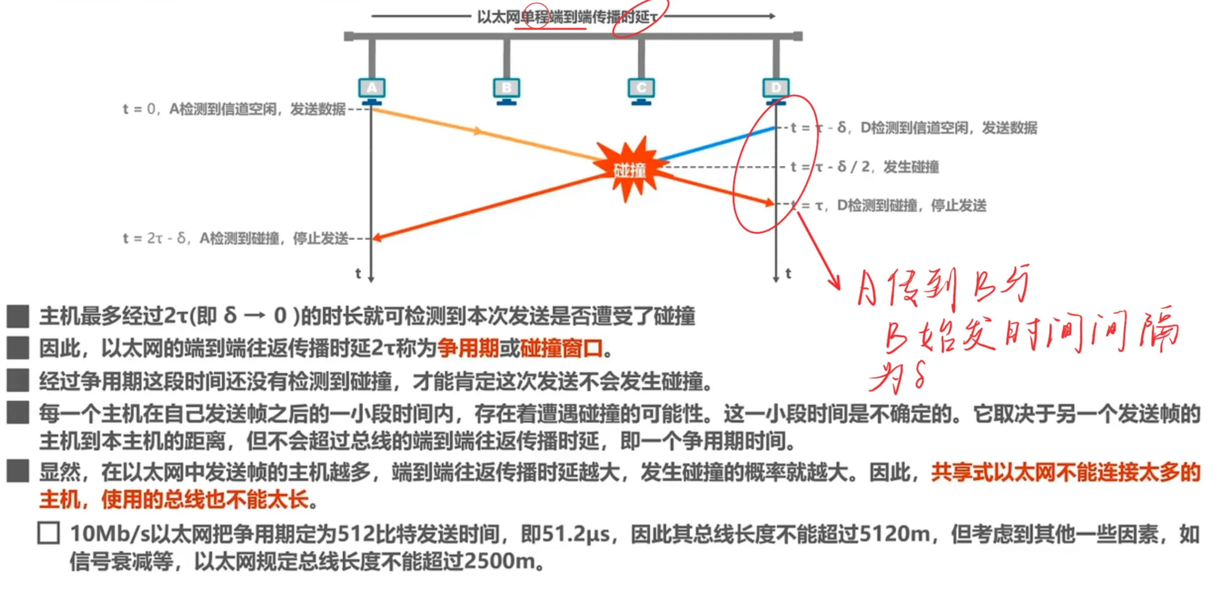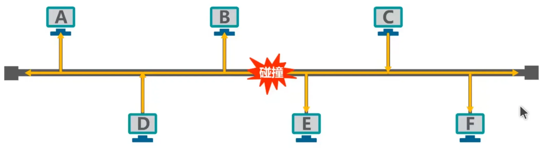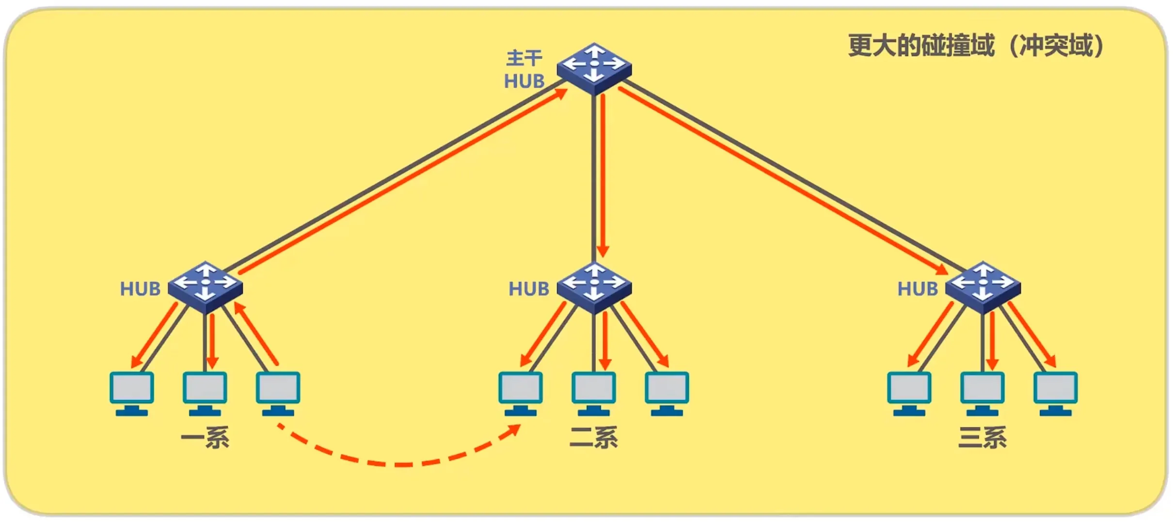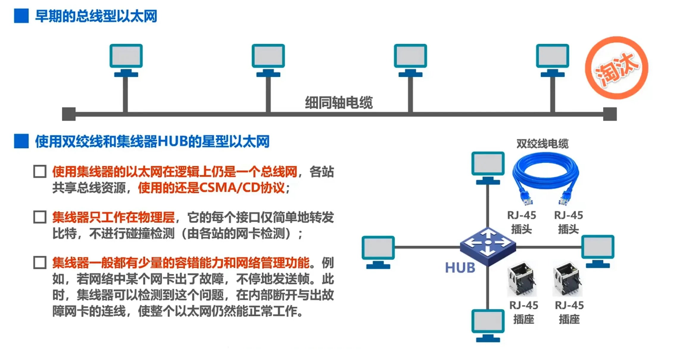 ■ 使用集线器作为互连设备的以太网仍然属于共享总线式以太网。集线器互连起来的所有主机共享总线带宽属于同一个碰撞域和广播域。