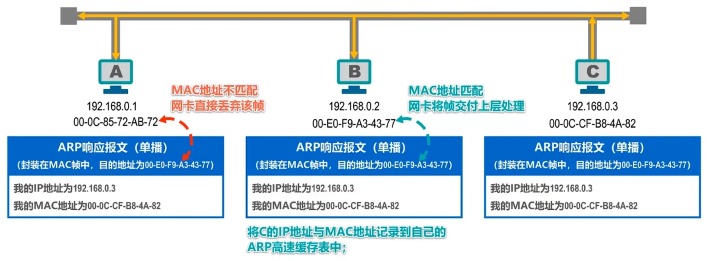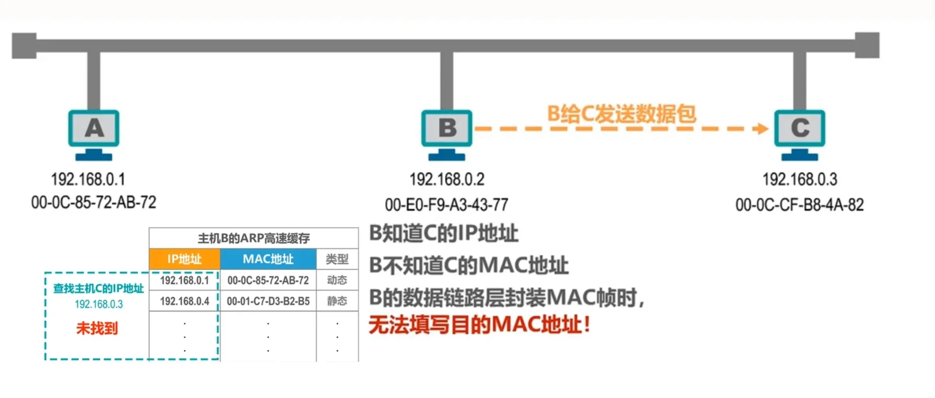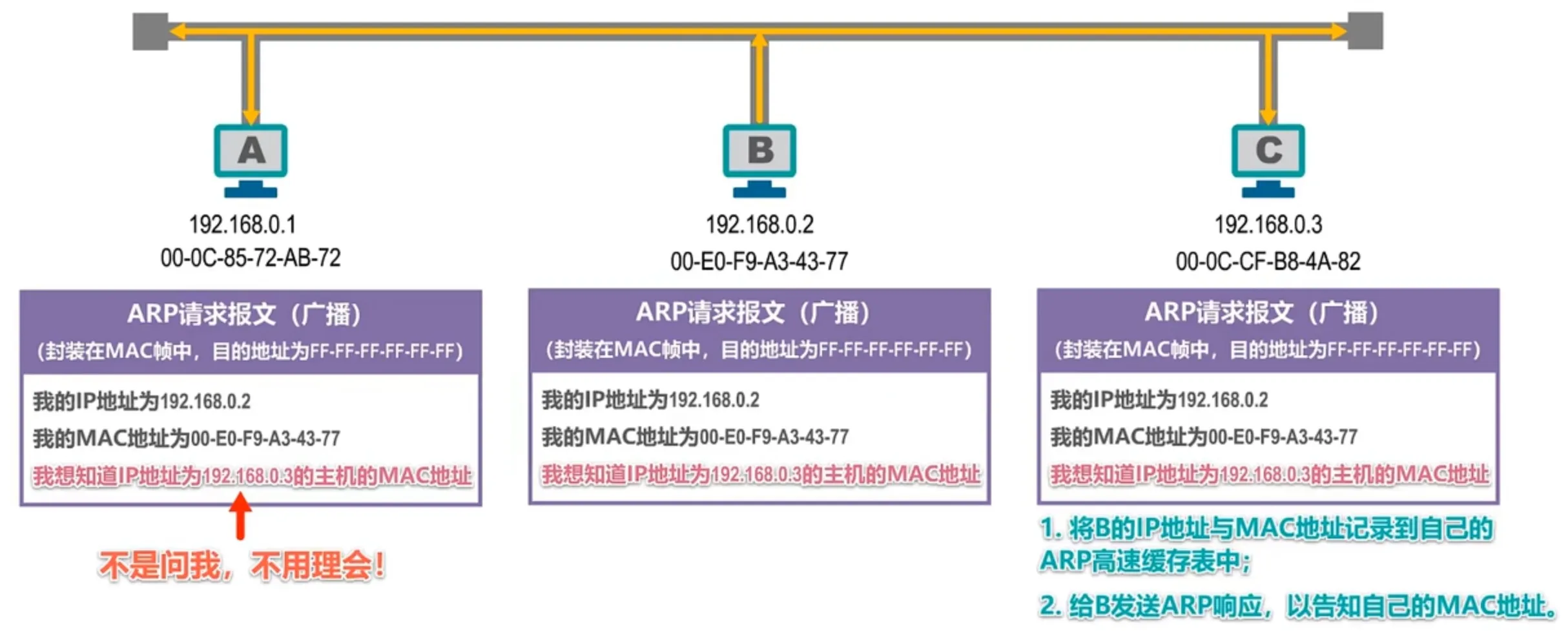 在本地ARP高速缓存中,若未找到对应的MAC地址,发送ARP请求报文(广播)