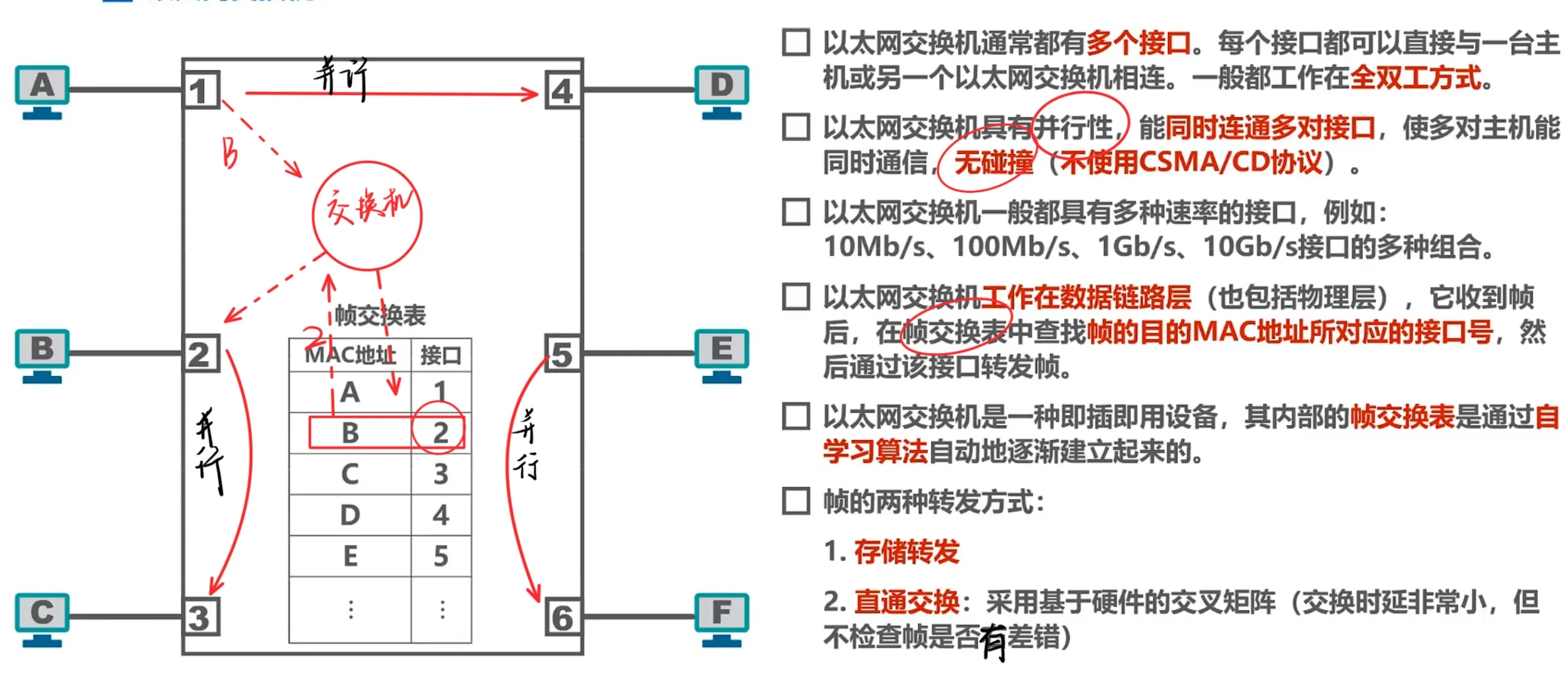 ■ 使用交换机作为互连设备的以太网,称为交换式以太网。交换机可以根据MAC地址过滤帧,即隔离碰撞域。