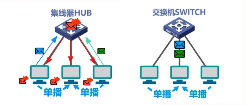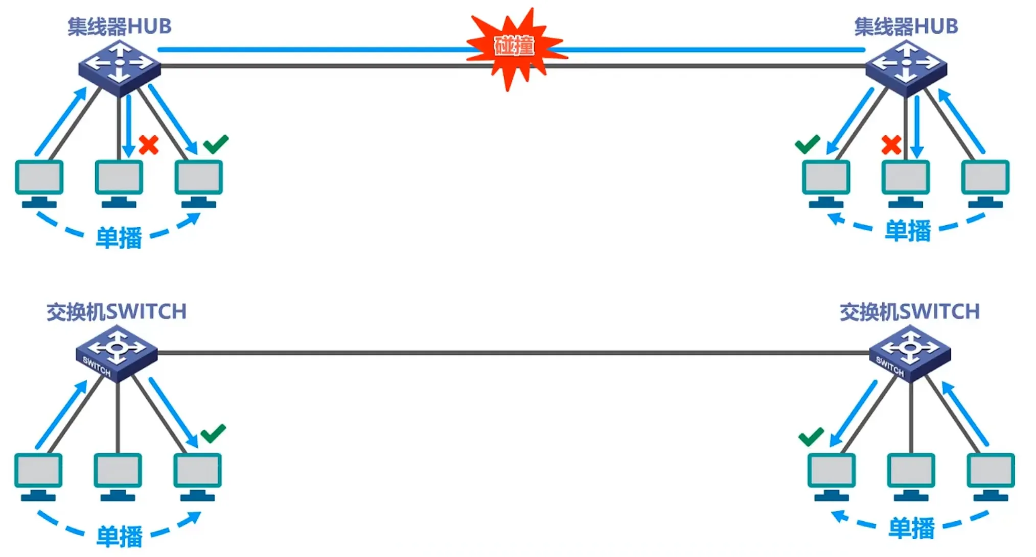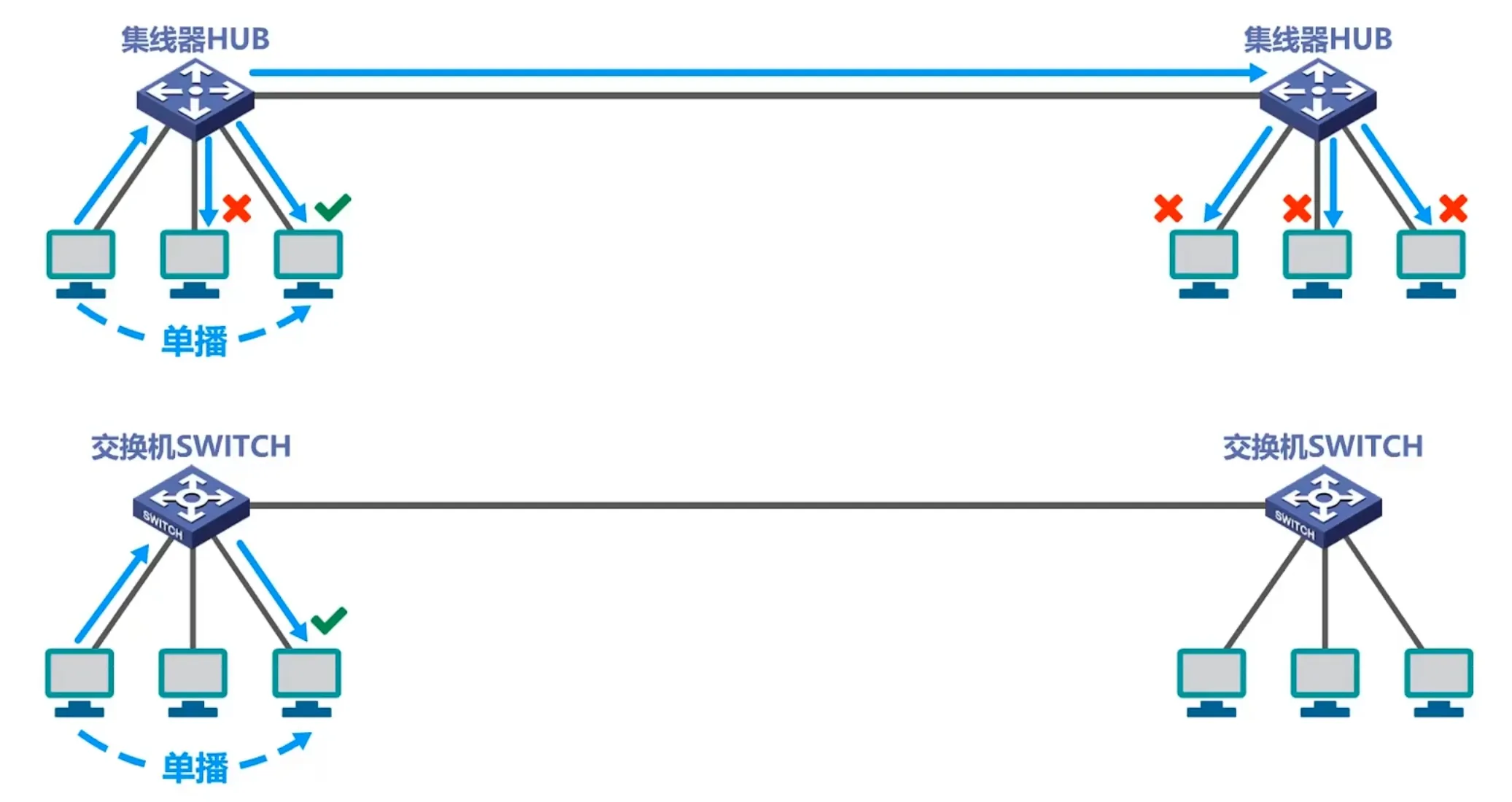 4.对于二者扩展以太网进行发送单播帧,交换机对比集线器有显著优势