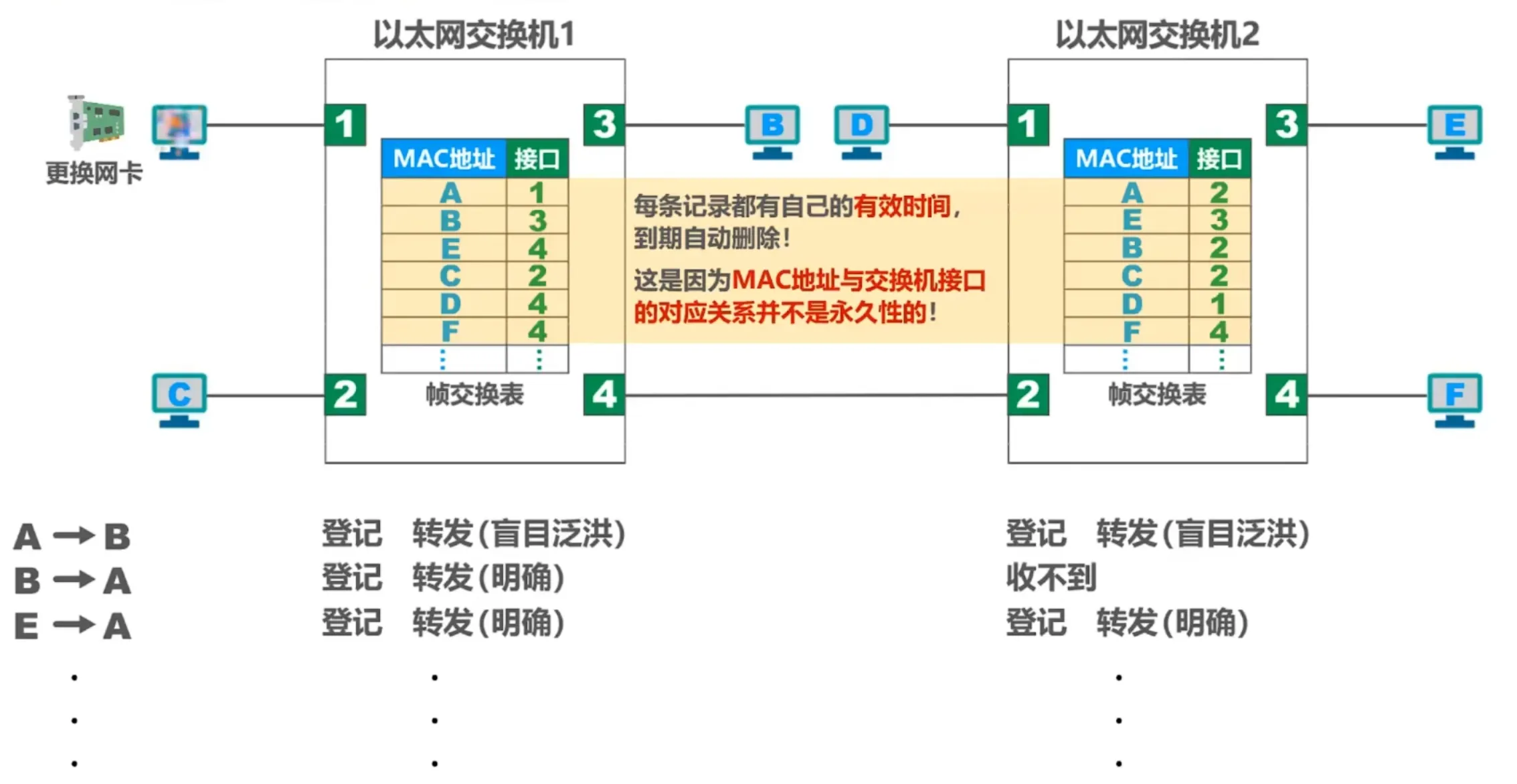■ 帧交换表中的每条记录都有自己的有效时间,到期删除。原因如下
