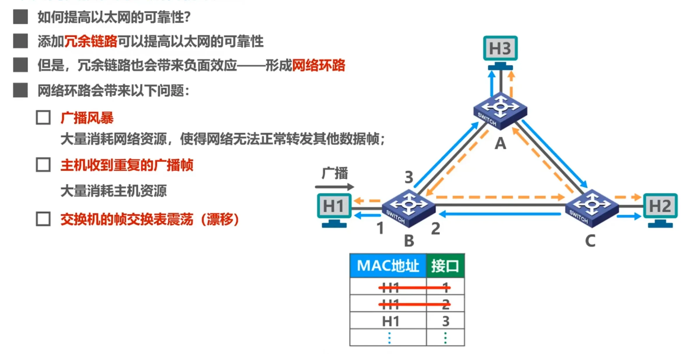 但添加冗余链路形成网络环路会使得广播帧不断的在各链路中循环(逆时针和顺时针同时进行)转发,造成其他的负面影响