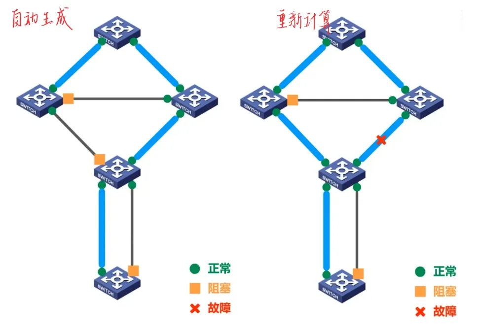 □ 当首次连接交换机或网络物理拓扑发生变化时(有可能是人为改变或故障),交换机都将进行生成树的重新计算。