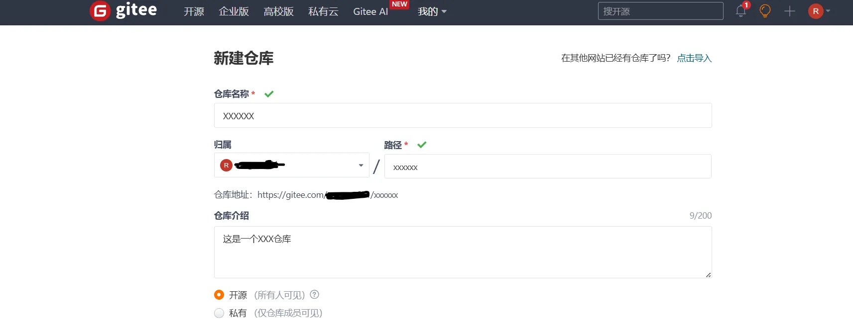 进入Gitee官网点击右上角‘+’号-新建仓库