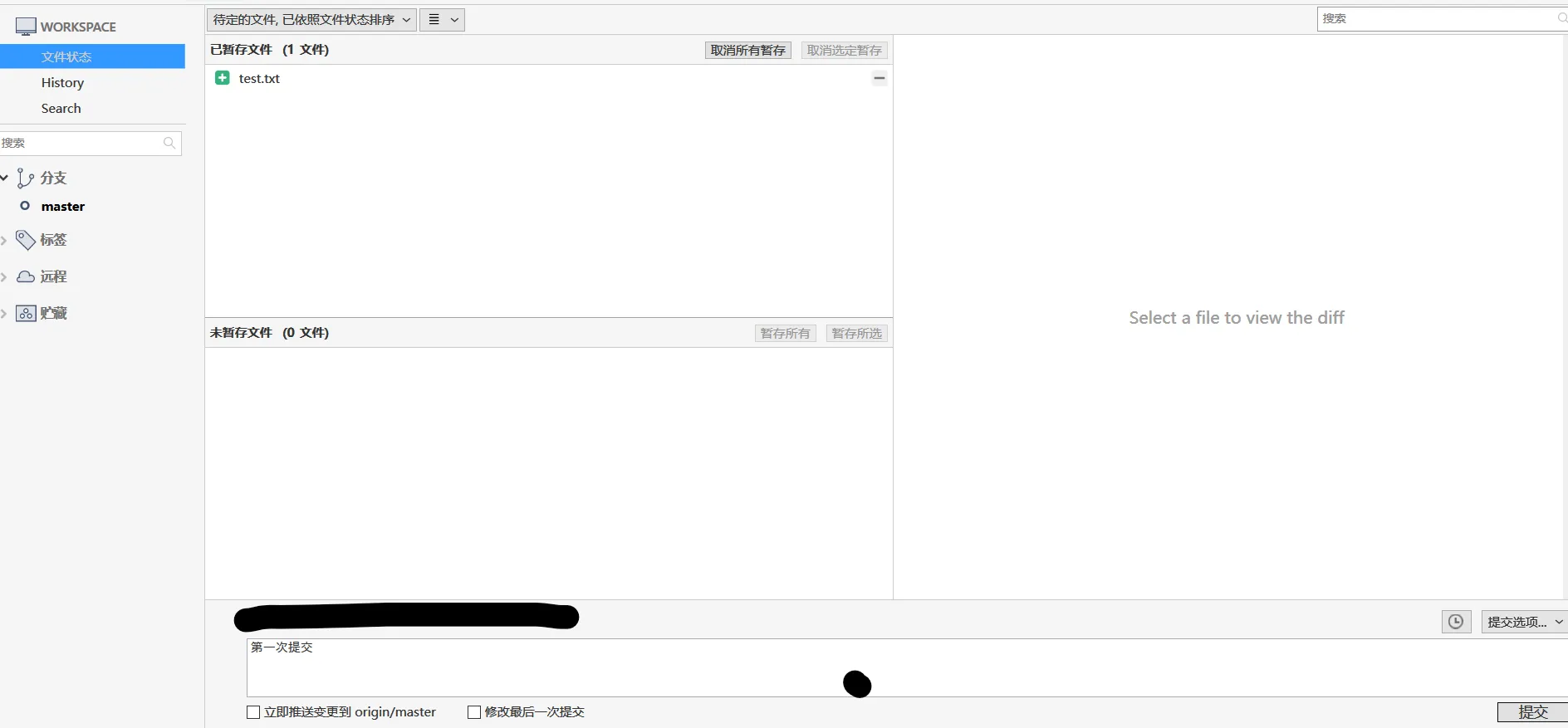 在文件夹内添加test.txt文件后,可在Sourcetree-文件状态里查询未暂存文件