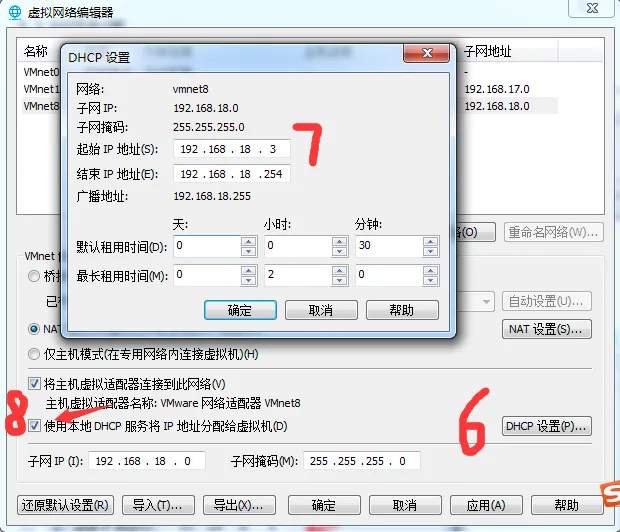 点击位置6,弹出窗口,在位置7更改启示IP地址和结束IP地址,这里选择3~254,避开网关