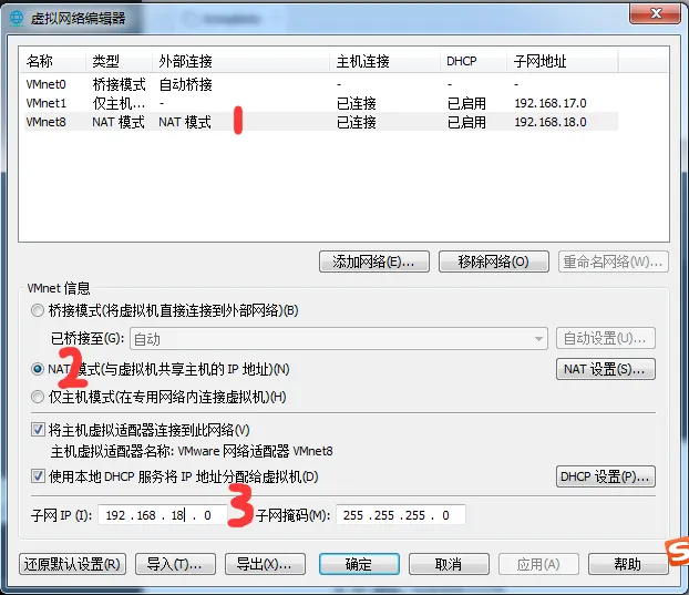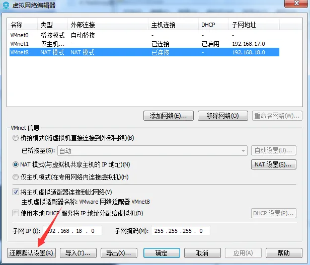 如果没有出现VMnet8,进入VM的虚拟网络编辑器中,还原默认设置即可。【如果有VMnet8,不需要操作下图】
