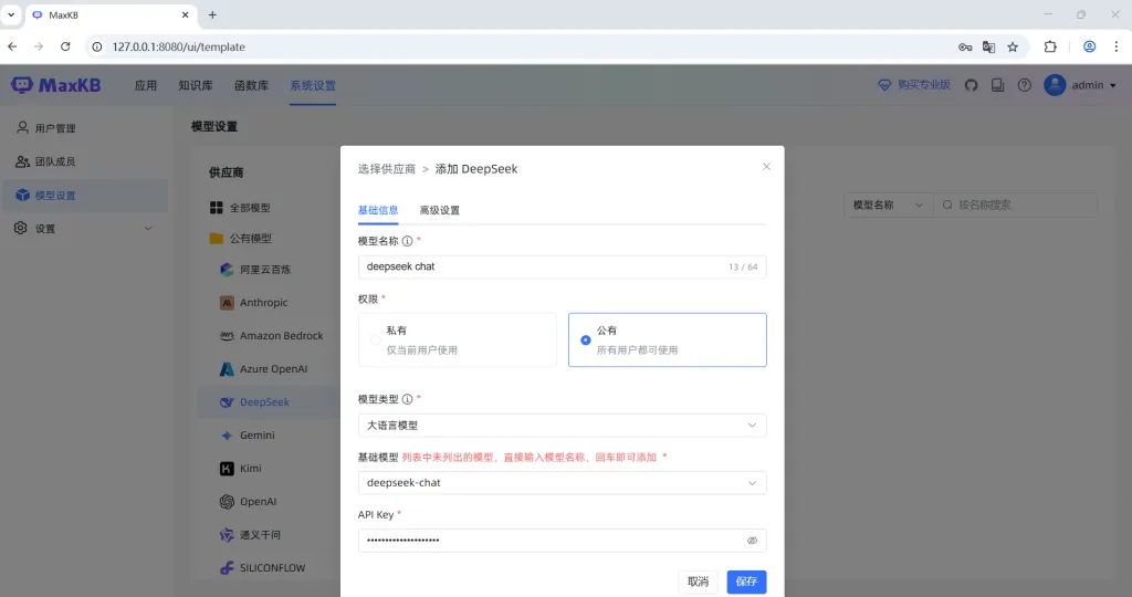在MaxKB后台-系统设置-模型设置中,创建模型