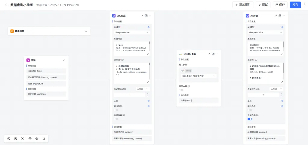 流程如下图所示:SQL生成-Mysql查询-AI对话(通过添加组件获取)