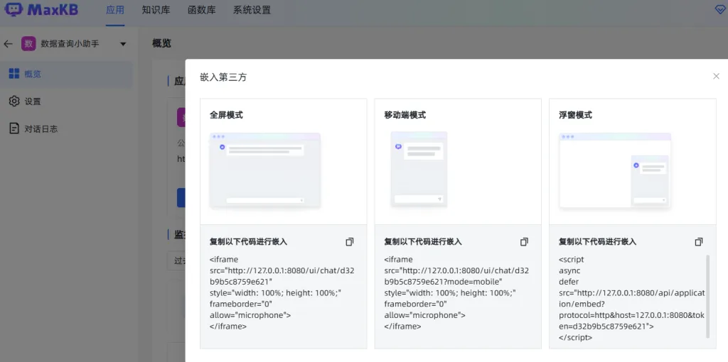 MaxKB后台-应用-选择创建的应用-概览-嵌入第三方