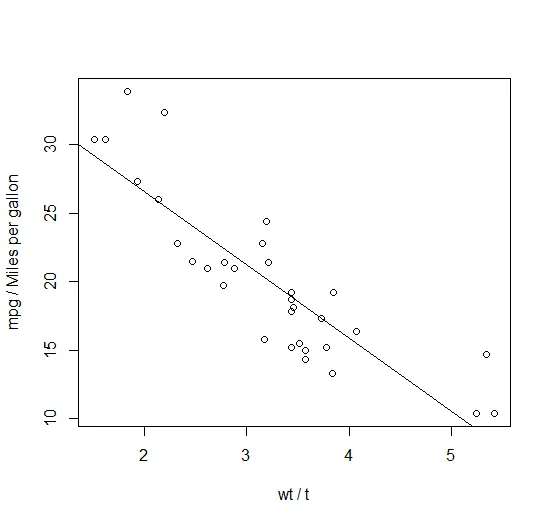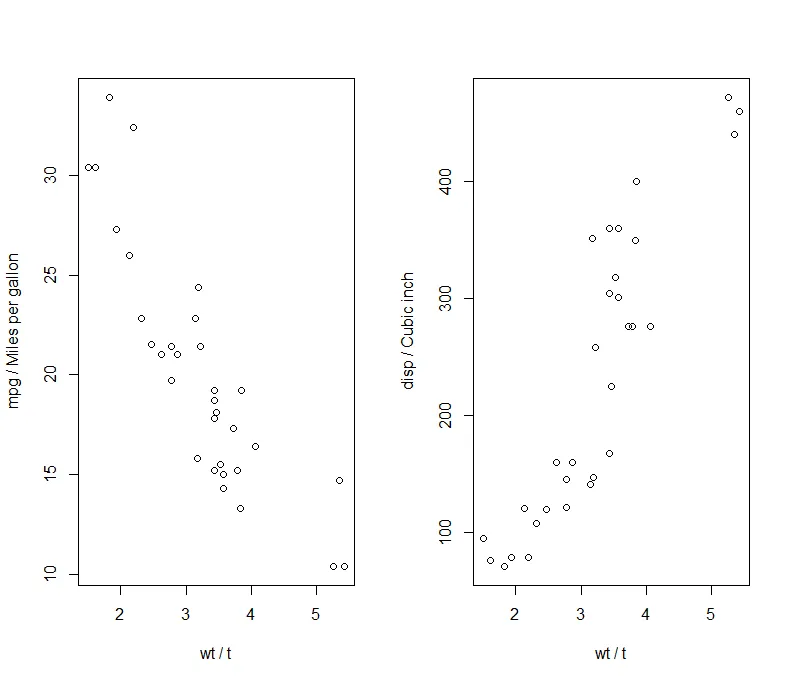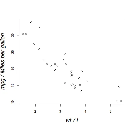 plot(wt,mpg, xlab="wt / t",ylab="mpg / Miles per gallon")