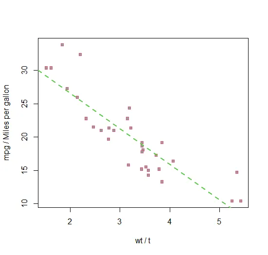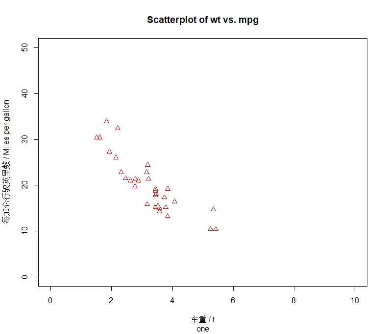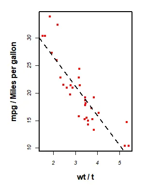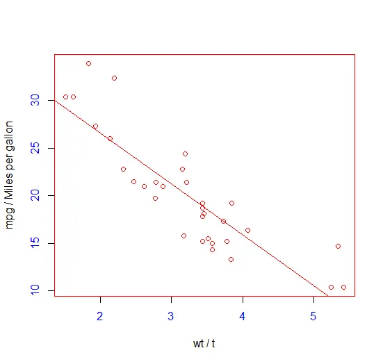 plot(wt,mpg,xlab="wt / t",ylab="mpg / Miles per gallon", pch=20,col="red")