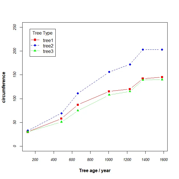lines(age,circumference_tree3,type="b",pch=17,lty=3,col="green")