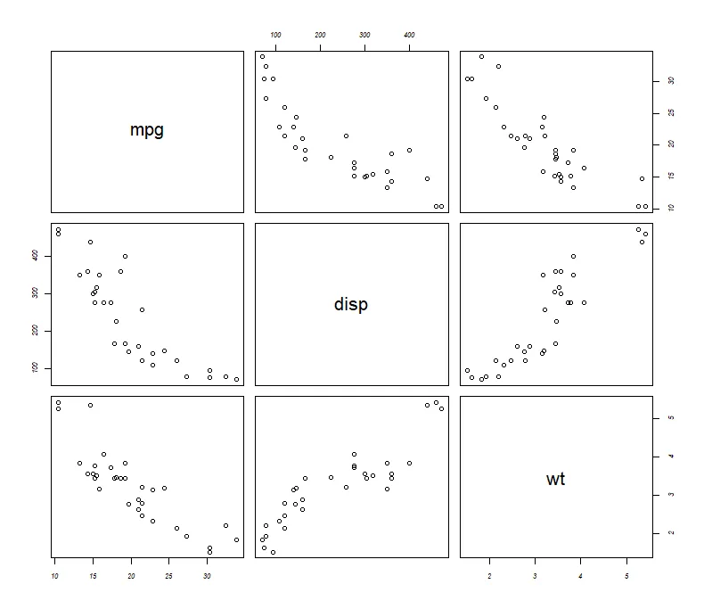 pairs(~mpg+disp+wt, data=mtcars) # ①
