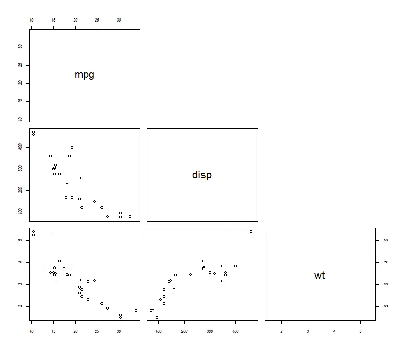 pairs(~mpg+disp+wt, data=mtcars, upper.panel = NULL) # ②