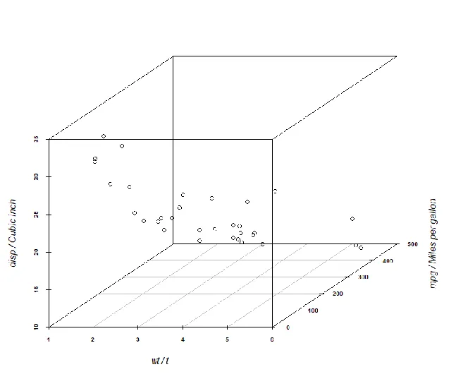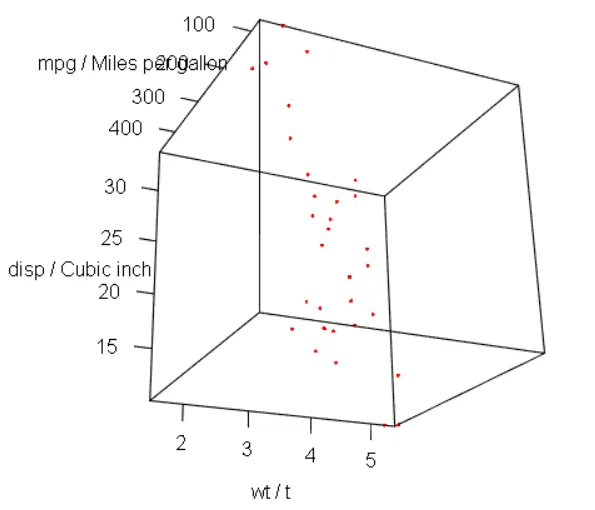 xlab="wt / t",ylab="mpg / Miles per gallon", zlab="disp / Cubic inch")