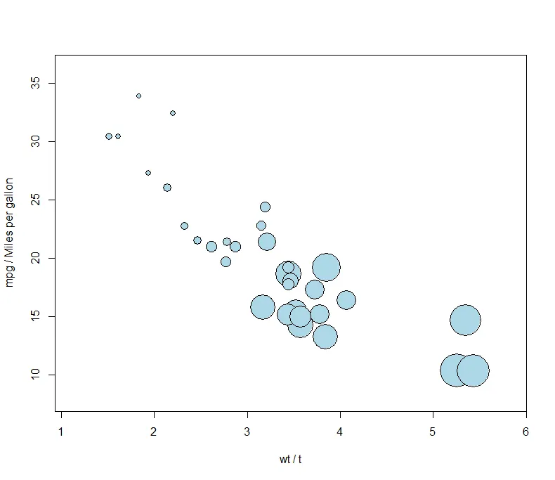symbols(wt,mpg,circles=disp,inches=0.25,bg="lightblue", xlab="wt / t",ylab="mpg / Miles per gallon")