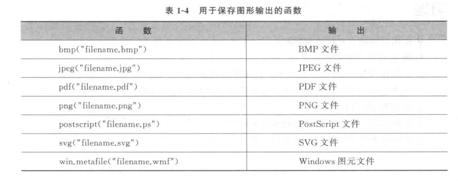 虽然sink()可以重定向文本输出,但它对图形输出没有影响。要重定向图形输出,使用表1-4中列出的函数即可,最后使用dev.off()将输出返回到终端