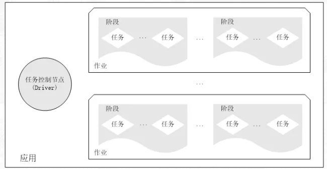 - 一个应用(Application)由一个任务控制节点(Driver)和若干个作业(Job)构成
