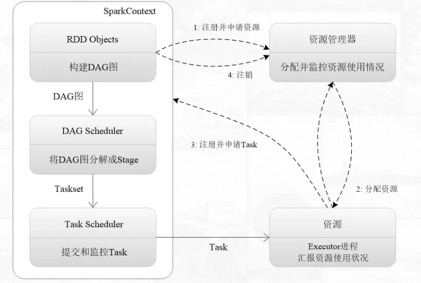 - Executor向SparkContext申请任务,任务调度器将任务分发给Executor运行,同时,SparkContext将应用程序代码发放给Executor